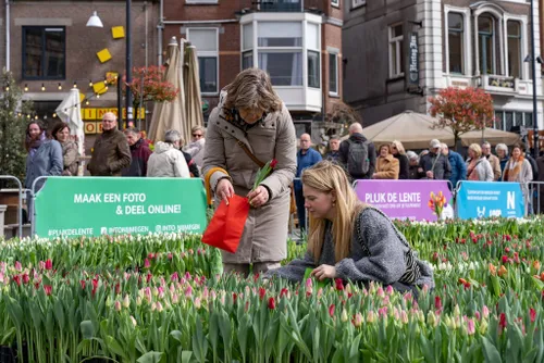 Grote Markt in Nijmegen van 12.00 tot 17.00 uur omgetoverd tot een grote kleurrijke tulpenpluktuin met
